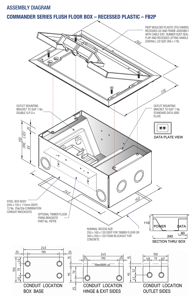 - Capacity for 2 standard outlet plates (1 x double power & 1 x Data and/or A.V.).