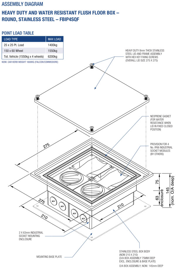 - Heavy duty and water resistant – load rated floor box suitable for vehicular traffic.